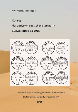 m August 2016 erscheint als Sonderdruck der Arbeitsgemeinschaft der Sammler Deutscher Kolonialpostwertzeichen e.V. erstmalig ein Katalog der aptierten deutschen Stempel in Südwestafrika ab 1915. Dieser Katalog ist eine Ergänzung zu unserem aktuell in der 17. Auflage vorliegenden Stempelkataloges der ehemaligen Deutschen Kolonien und Auslandspostämter. Nach einem Vorwort mit Einführung auf Deutsch und Englisch erfolgt die Katalogisierung der Stempel, wobei jeweils Abbildungen des ursprünglichen Stempels aus Deutsch Südwestafrika der überarbeiteten Version gegenübergestellt und auf die jeweiligen Veränderungen hingewiesen wird. Für jeden Stempel werden neben dem bekannten Verwendungszeitraum und einer Einschätzung zur Häufigkeit auch der ungefähre Marktpreis in Euro für den Stempel auf Beleg angeführt. Es werden auch jeweils Beispiele für Belege mit diesen Stempeln gezeigt.