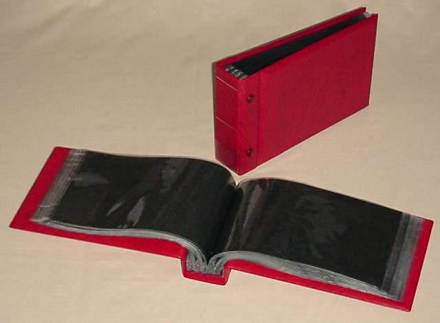 mit einem Klarsichtfenster im Albumrücken zur Bezeichnung der Alben.