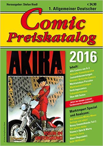 Mit der Ausgabe von 2016 ist der Münchner Comic-Händler und Veranstalter von Sammlerbörsen Stefan Riedl erstmals Herausgeber. Auch er bleibt bei der bewährten Organisation und Aufmachung. Das Buch listet alphabetisch nach Serientiteln sortiert alle deutschsprachigen Comics auf, die zwischen 1945 und Mitte 2015 erschienen sind. Anhänge befassen sich mit der wenig erforschten Zeit ab 1846 und der Comic-Sekundärliteratur. Zur Auflockerung sind auf jeder Seite streichholzschachtelgroße farbige Cover abgebildet, die das Blättern im Katalog zu einem durchaus sinnlichen Vergnügen machen. Der Katalog ENTHÄLT neben dem Marktreport noch einen interessanten Artikel über die britische Comic-Szene, den Andreas Hanauer nicht nur geschrieben, sondern auch mit gelungenen Porträt-Zeichnungen von herausragenden englischen Comickünstlern wie Alan Moore, Garth Ennis oder Mark Millar illustriert hat.