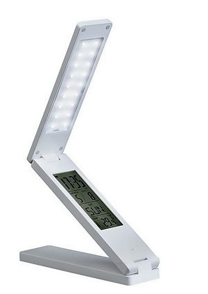 Mit dieser kleinen LED Klappleuchte sind Sie überall bestens ausgestattet. Ob Zuhause oder Unterwegs, die Lampe bietet kabelloses Licht in 2 Helligkeitsstufen überall dort wo es gebraucht wird. Auf dem Display wird die Uhrzeit, das Datum sowie die Temperatur angezeigt. Auch eine Weckfunktion ist integriert. Die Lampe lässt sich über das mitgelieferte USB-Kabel an jeder Steckdose oder am PC wieder aufladen. Perfekt auch