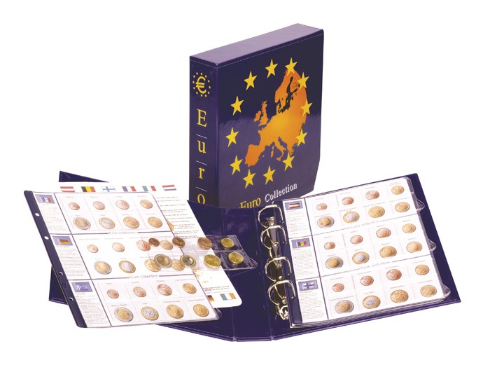 Dieses Album beinhaltet 7 farbige Vordruckblätter mit den Abbildungen der Euro-Kursmünzensätze der 19 Euroländer sowie 7 Münzblätter mit Hart-PVC Einlagen. Jede Einzelseite bietet Platz für die Kursmünzensätze von drei verschiedenen Ländern. Pro Land kann jeweils ein Münzensatz untergebracht werden. Das Album kann mit Ergänzungsblättern erweißert werden.