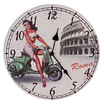 Mit dekorativem Motiv. Eine wunderschöne Wanduhr Das plakative Retro-Motiv mit der guten alten Vespa bringt ein Stück nostalgisches Urlaubsgefühl in Ihr Zuhause.
