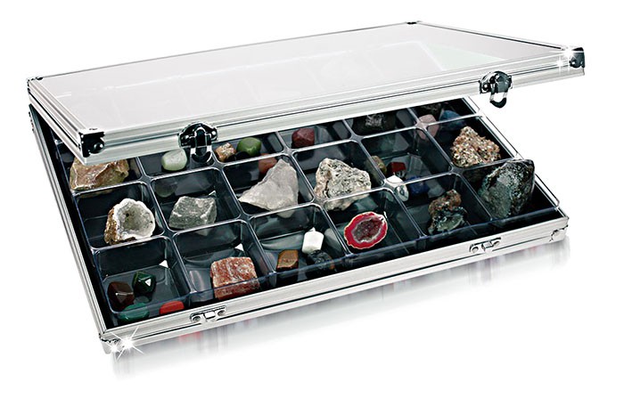 Sammelvitrine aus Aluminium mit transparentem Kunststoff-Einsatz mit 24 Fächern 65 x 58 mm.
