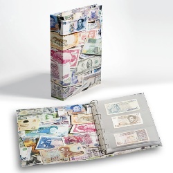 Hochwertiges Album mit 100 festeingebundenen Hüllen für 300 Banknoten. Die klarsichtigen, weichmacherfreien Hüllen fassen Banknoten bis 165 x 90 mm. Attraktive Optik des Binders durch farbige Banknoten-Motive. Praktisch und unempfindlich durch wischfesten Einband. Außenformat: 245 x 300 mm.