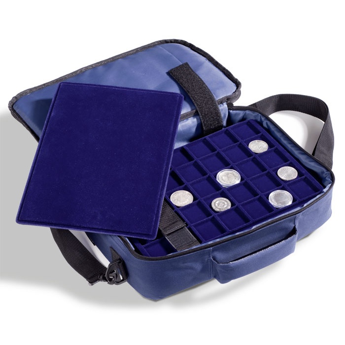 Diese Münztasche aus strapazierfähigem Nylon dient der Aufbewahrung und dem Transport von bis zu 12 Münztableaus* (L-Format). Je nach Facheinteilung der Tableaus faßt die Tasche somit bis zu 792 Münzen. Für einen sicheren Halt der Tableaus sorgen die beiden individuell einstellbaren Klettverschlüsse mit dem der samtbezogene Deckel fixiert werden kann. Auch bei senkrechter Lagerung sowie nur teilweißer Bestückung mit Tableaus bleiben alle Münzen an Ihrem Platz. Sicherer Verschluß der Tasche durch einen Zwei-Wege-Reisverschluß. Auf der Vorderseite der Tasche befindet sich eine zweiße Tasche mit zusätzlichen Fächern zur Mitnahme von z.B. Schreibutensilien, Handy, Lupen, Pinzetten o.Ä. Der robuste Nylonstoff ist zudem schmutz- und wasserabweißend. Inkl. verstellbarem Tragegurt. Format: 240 x 355 x 115 mm (B/L/H). Folgende 4 Tableaus sind bereits enthalten: