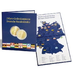 Sammelalbum aus hochwertig bedrucktem stabilen Karton, mit 16 vorgestanzten Einlagen zum Eindrücken von insgesamt 16 2-Euro-Münzen "Deutsche Bundesländer", Außenformat: 255 x 280 mm"