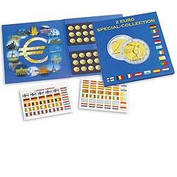 Sammelalbum aus hochwertig bedrucktem stabilen Karton, mit zwei vorgestanzten Einlagen aus Karton zum Eindrücken von insgesamt 48 2-Euro-Münzen, inkl. Stickerset mit Flaggen (mehrfach) aller Euro-Länder zur individuellen Kennzeichnung der 2-Euro-Münzen, Außenformat: 255 x 280 mm.