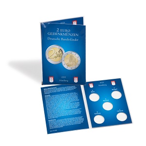 Sammelkarte aus stabilem Karton mit Ausstanzungen für 5 deutsche 2-Euro-Gedenkmünzen „Hamburg„ Jg. 2023. Berücksichtigung der 5 Prägestätten (A, D, F, G, J). Die Münzen werden in einer glasklaren, weichmacherfreien Kunststofffolie untergebracht und sind beidseitig zu betrachten. Mit interessanten Hintergrundinformationen und Bildmaterial. Auch optimal als Geschenkverpackung.