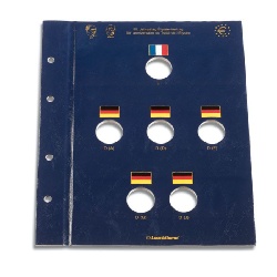 1 VISTA-Münzblatt aus stabilem Karton für die französische 2-Euro-Gedenkmünze sowie alle 5 deutschen 2-Euro-Gedenkmünzen (mit Berücksichtigung der 5 Prägestätten A, D, F, G, J) der Gemeinschaftsausgabe „50. Jahrestag Élysée-Vertrag„. Einschiebefenster aus Hart-PVC. Dunkelblau mit farbig aufgedruckten Flaggen. Zur Unterbringung in allen OPTIMA-Bindern.
