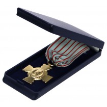 Dunkelblaues Hartschalen-Etui aus Kunststoff mit tiefgezogener, dunkelblau-beflockter einlage. Mit Kunststoff Clip zur Besfestigung der orden. Deckelkissen aus weißer Seide. Aussenabmessungen 11 x 5 x 2 cm.