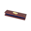 hochwertiges Münzetui in mahagonifarbener Holzmaserung. Deckelkissen in dunkelblauer Seide, Bodenteil mit vorgeformten Vertiefungen."