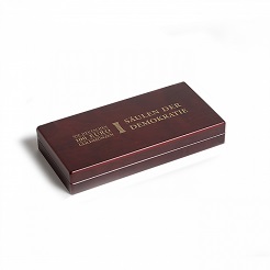 Münzetui in edler, mahagonifarbener Holzmaserung zur Unterbringung der 3 deutschen 100-Euro-Goldmünzen der Serie „Säulen der Demokratie„ in Originalkapseln. 1 Einlage mit