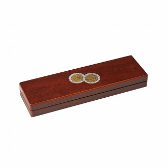 Etui zur Unterbringung der 5 deutschen 2-Euro-Gedenkmünzen 2019 „30 Jahre Mauerfall„ (Prägebuchstaben A, D, F, G, J) in Kapseln (InnenØ 26 mm). Edle, mahagonifarbene Holzmaserung. Themenspezifischer Deckel- und Kissendruck. Deckelkissen mit