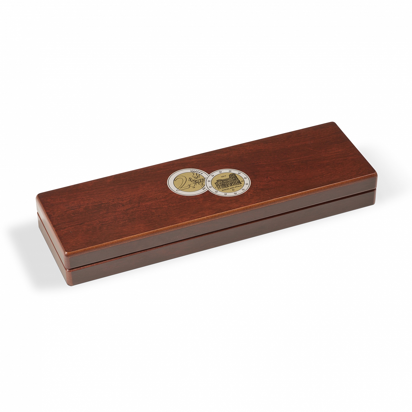 Etui zur Unterbringung der 5 deutschen 2-Euro-Gedenkmünzen 2017 „Rheinland-Pfalz„ (Prägebuchstaben A, D, F, G, J) in Kapseln (InnenØ 26 mm). Edle, mahagonifarbene Holzmaserung. Themenspezifischer Deckeldruck (Münzmotiv: Porta Nigra). Deckelkissen mit