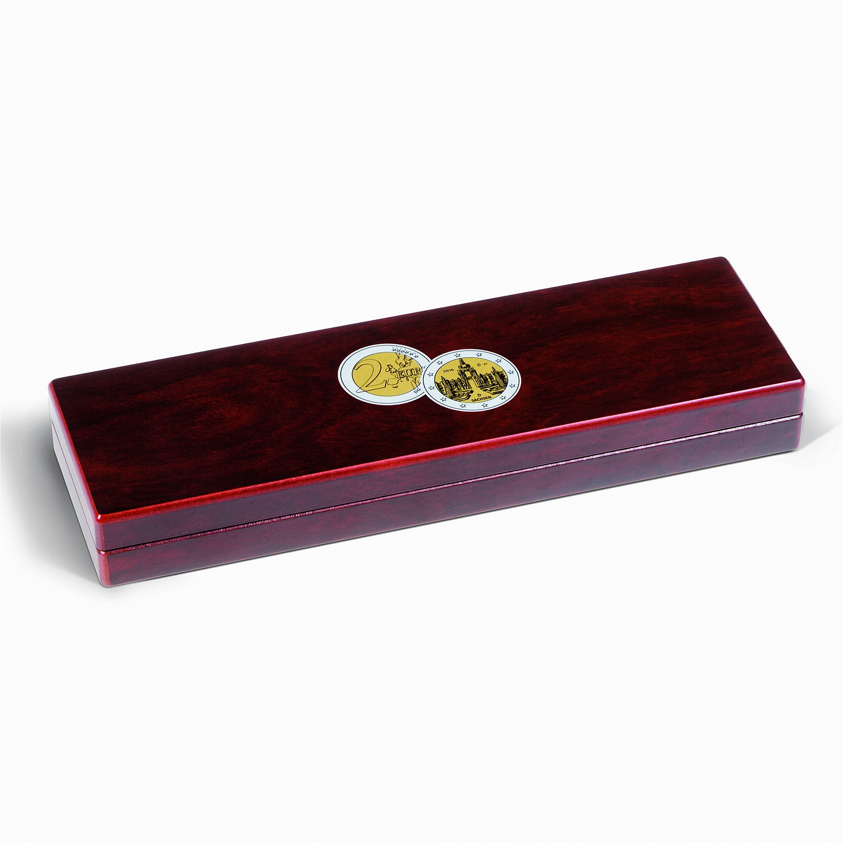 Etui zur Unterbringung der 5 deutschen 2-Euro-Gedenkmünzen 2016 „Sachsen„ (Prägebuchstaben A, D, F, G, J) in Kapseln (InnenØ 26 mm). Edle, mahagonifarbene Holzmaserung. Themenspezifischer Deckeldruck (Münzmotiv: Dresdner Zwinger). Deckelkissen mit