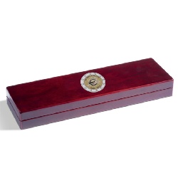 Münzetui VOLTERRA für alle 5 deutschen 2-Euro-Gedenkmünzen 10 Jahre Euro-Bargeld" in Kapseln* (Prägestätten A, D, F, G, J). Oberfläche in edler mahagonifarbener Holzmaserung. Themenspezifischer Deckel- und Kissendruck. Kapseln nicht im Lieferumfang enthalten. Außenformat: 260 x 80 mm*Innendurchmesser 26 mm"