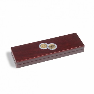 Etui zur Unterbringung der 5 deutschen 2-Euro-Gedenkmünzen 2019 „Bundesrat„ (Prägebuchstaben A, D, F, G, J) in Kapseln (InnenØ 26 mm). Edle, mahagonifarbene Holzmaserung. Themenspezifischer Deckeldruck (Münzmotiv: Preußisches Herrenhaus). Deckelkissen mit