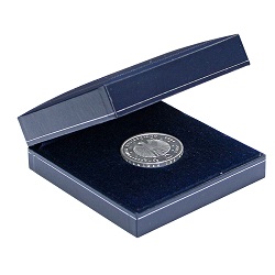 Safe Eindrück-Münz-Etui Nr. 7916 für 1€ Münzen-Satz oder für Münzen bis 80mm Ø Dunkelblaues Kunstoff-Etui, mit silber-Schmuckprägung und Hartschaumeinlage.