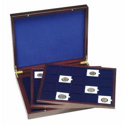 Hochwertige Münzkassette mit 3 Einlagen in mahagonifarbener Holzmaserung mit einem festen Tableau und zwei herausnehmbaren Tableaus.