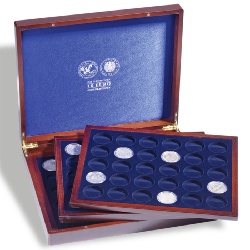 Hochwertige Münzkassette mit 3 Einlagen für 90 deutsche 10-Euro-Gedenkmünzen in Original-Kapseln oder LEUCHTTURM CAPS 32.5*. 3 Einlagen mit veloursartiger Oberfläche und je 30 runden Feldern (Ø 38 mm). Kassette in mahagonifarbener Holzmaserung. Edler Deckel- und Kissendruck. Sicherer und unauffälliger Magnetverschluss. Außenformat: 330 x 270 x 55 mm. *Kapseln nicht im Lieferumfang enhalten