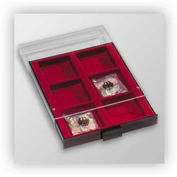 Die XL-Münzbox besteht aus einer rauchfarbenen Schublade und aus einer dunkelroten Einlage. Diese Box besitzt 2 x 3 eckige Einteilungen für ein Format von 86 x 86 mm. Sie können daher z.B. Münzen oder Medaillen bis zu einer Höhe von 22 mm hier gut unterbringen. Außenformat (B/L/H): 236 x 303 x 33 mm.