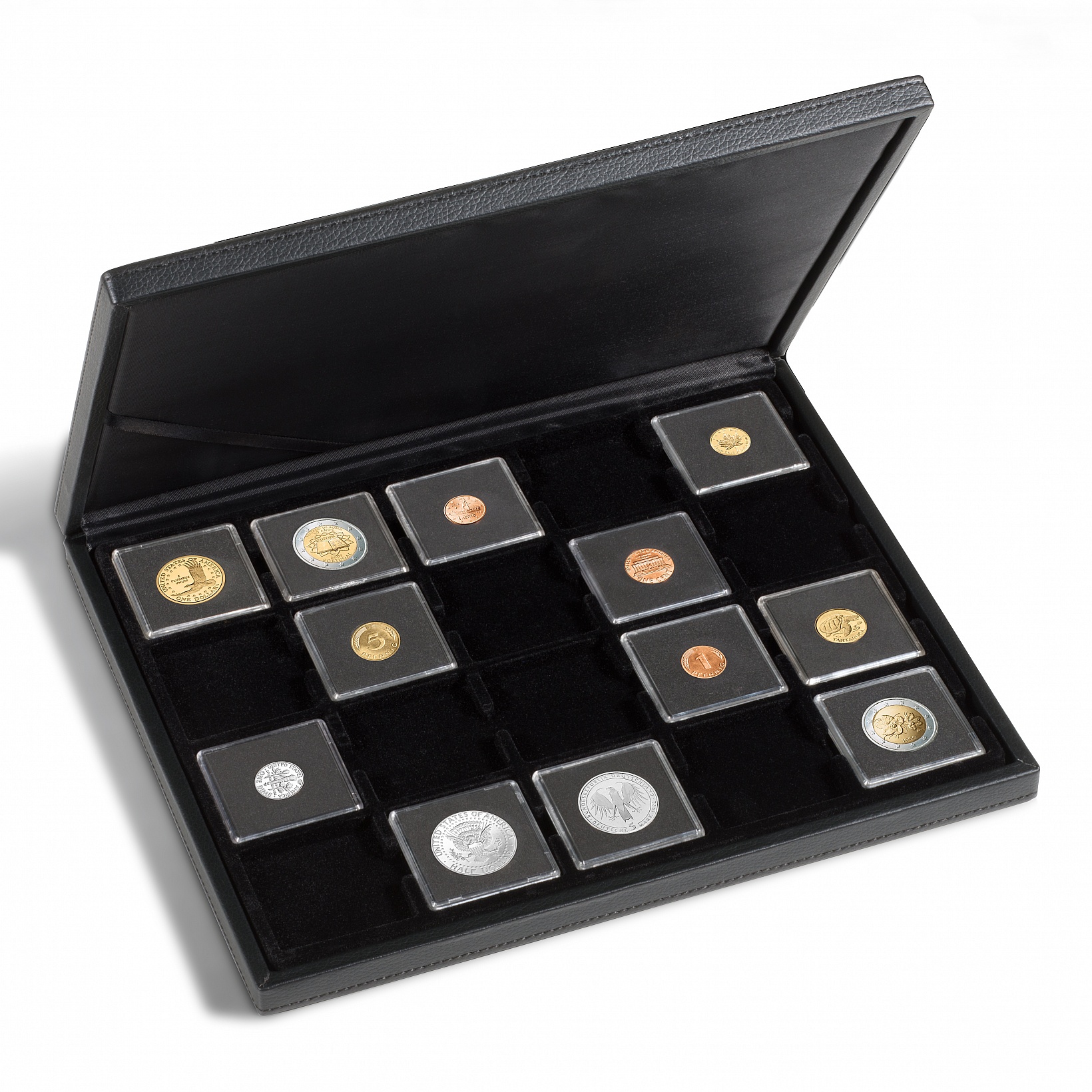 Münzkassette aus schwarzem, wattierten Kunstleder zur Unterbringung von 20 QUADRUM-Kapseln oder Münzrähmchen. Einlage mit