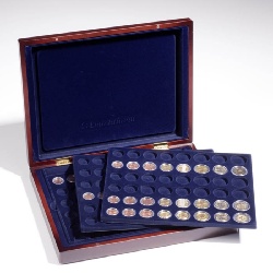 Münzkassette im edlen mahagonifarbenen Holzdesign, inkl. drei Velourtableaus, mit Magnetverschluß. Für 18 komplette Euro-Kursmünzensätze in Kapseln. 3 Einlagen mit je 48 runden Feldern. Außenformat: 343x265x48 mm.