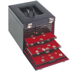Passend für 10 Standard-Münzboxen im Format 236 x 303 x 20 mm, 4 vernickelte Füße, an der kurzen Seite aufklappbar, Außenmaß: 328 x 265 x 245 mm.