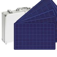 Sammelkoffer im edlen Aluminium-Design. Die passenden Tableaus sind äußerst stabil und rundum mit Velours überzogen. Dies gewährleistet eine angenehme Handhabung. Die acht Kunststofffüße garantieren einen sicheren Stand und schützen den Tisch, das Regal etc. vor Kratzern. Der Koffer ist abschließbar.