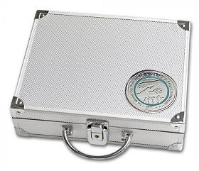 Alu-Metallkoffer mit Metallecken und -Kanten, eleganter Tragegriff, abschließbar mit 2 Schlüssel, innen jeweils mit blauer Veloursausstattung.